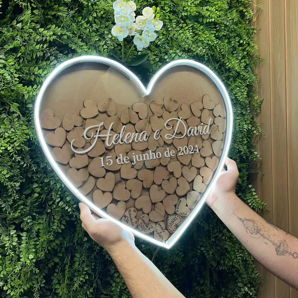 Eternize o momento do seu casamento com essa decoração! Os convidados preenchem os nomes no momento em que entram, e depositam dentro do coração maior, que funciona como uma luminária decorativa para os noivos usarem depois.